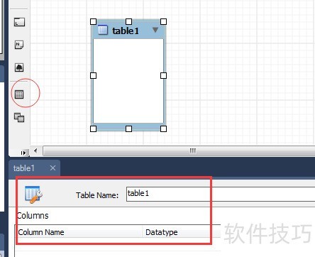 21、 双击放置新表格工具,将其拖至面板,右键点击表格1,调整其属性设置。