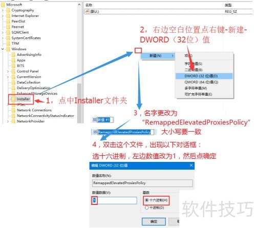 3、 在安装程序中创建一个32位DWORD值,命名为RemappedElevatedProxiesPolicy,通过右键修改该文件,将其数值设置为1即可完成配置。