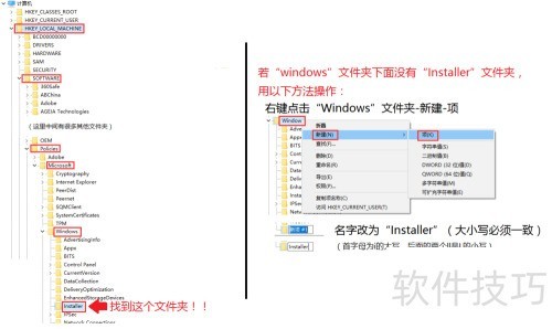 2、 进入注册表编辑器,定位到 HKEY_LOCAL_MACHINESOFTWAREPoliciesMicrosoftWindows 路径,检查是否存在名为 Installer 的项。若不存在,可右键点击 Windows 文件夹,选择新建项,并将其命名为 Installer,以便后续配置相关策略参数。