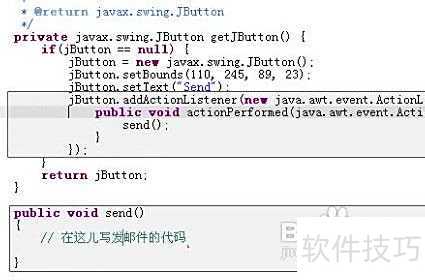 10、 在Java Beans视图中选择actionPerformed事件,然后切换至Source视图,并在此处编写相应代码。