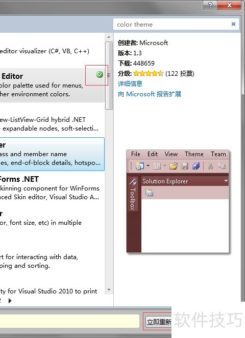 6、 安装完成后,右侧会出现绿色勾号,表示安装成功,随后点击下方立即重新启动按钮,重启VS2010即可。