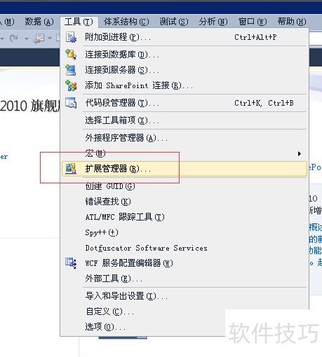 1、 启动VS2010,依次点击菜单栏的工具和扩展管理器即可进入相应界面。