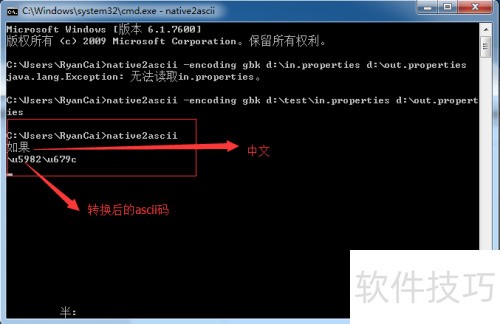 3、 若不使用文件,可直接在命令行中运行。先在cmd输入native2ascii并回车,接着键入需转换的中文字符,再次回车即可完成转换,操作所示。