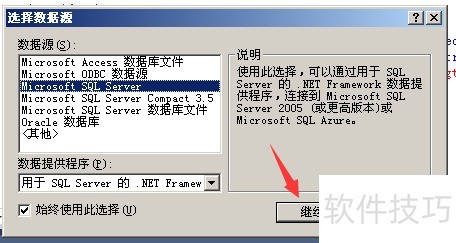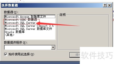 3、 连接数据库后,弹出数据源选择窗口,从中选定 Microsoft SQL Server 作为数据源选项。