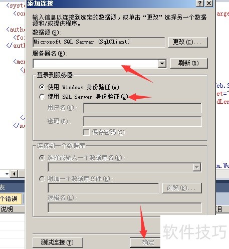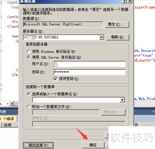 6、 在SQL Server身份验证中输入用户名和密码,点击确定,即可成功建立数据库连接。