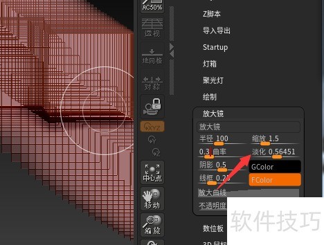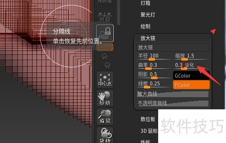 在ZBrush 2021.6.2中,将淡化值设为0.3的方法如下:进入笔刷设置,找到Falloff选项,点击并调整数值至0.3即可完成设置。