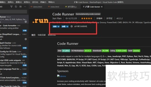 2、 在扩展商店中搜索code runner即可找到相关插件。