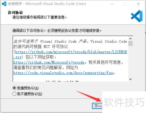 3、 选择下载Windows版VS Code,下载完成后进入保存目录,双击安装文件。阅读许可协议,勾选我接受协议,然后点击右下角的下一步继续安装操作。