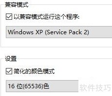 3、 勾选以兼容模式运行此程序,从下拉菜单中选择 Windows XP(Service Pack 2)。接着勾选简化颜色模式,在对应下拉列表中选择16色(65536色)。设置完成后,点击确定按钮保存配置,即可完成兼容性调整,具体操作可参考附图示例。