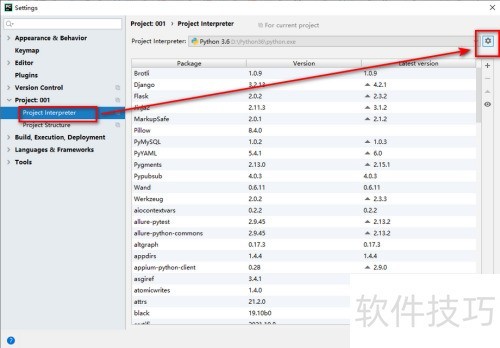 2、 进入项目菜单,选择项目解释器,然后点击添加按钮进行配置。