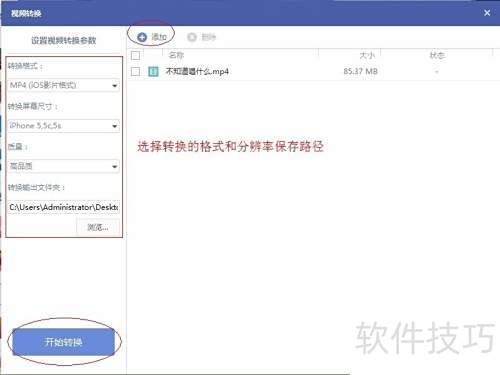 2、 启动视频转换软件,点击添加导入视频文件,左侧选择目标格式与设备型号,设定输出保存路径,最后点击开始转换即可完成操作。