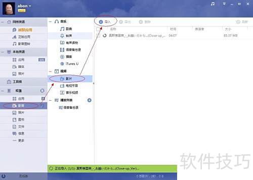 3、 转换完成后,连接设备与PP助手,进入设备栏的影音选项,选择影片并点击导入,将已转换的视频文件添加进去。
