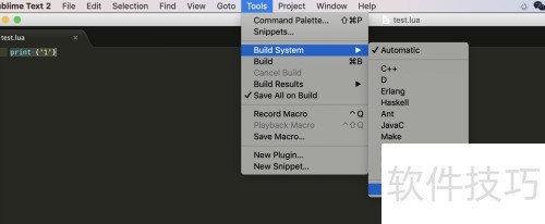 7、 重新启动Sublime后,进入Tools > Build System即可看到Lua选项,此时便可进行Lua代码的编译与运行,操作简便且高效。