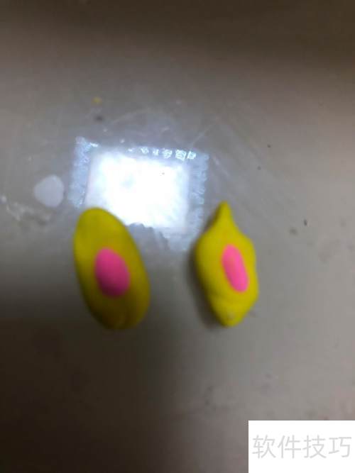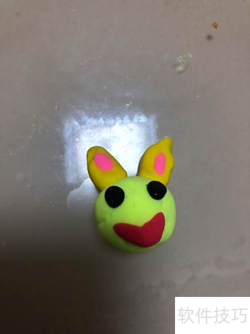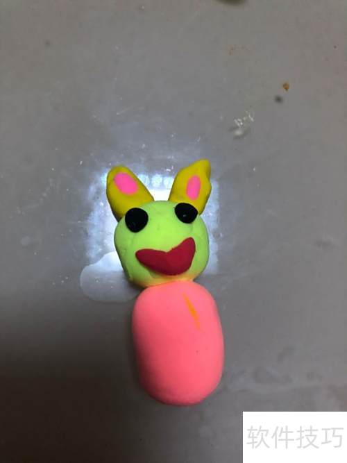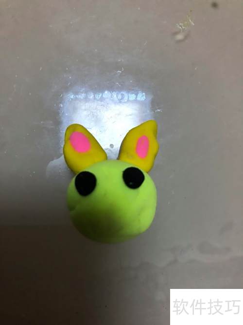 2、 取黄色彩泥搓成两条长条,再取粉色彩泥搓成两条,粘在黄色长条上端,固定于头部作为耳朵。