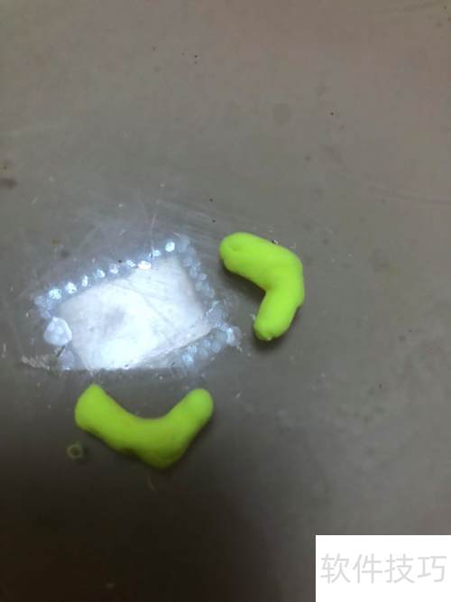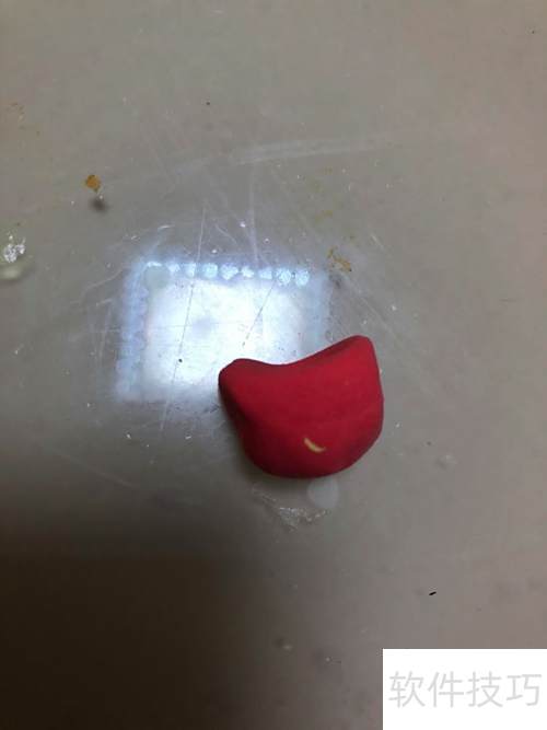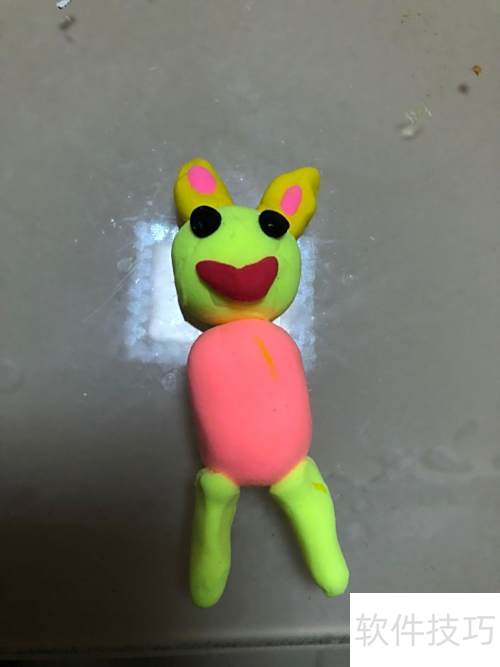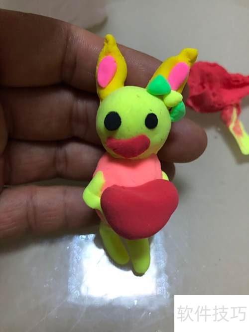 3、 将红色彩泥揉成弯曲状作为嘴巴粘好,橙色彩泥搓成椭圆形连接其上,再用绿色彩泥揉出两条长条并粘贴固定。