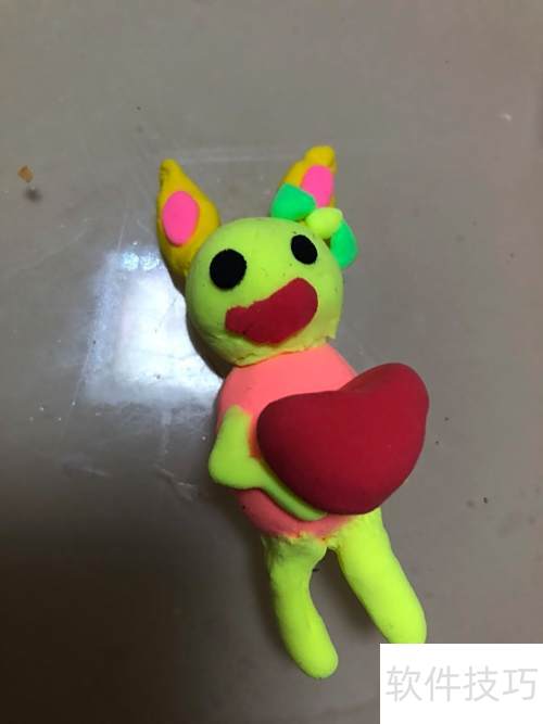 4、 取绿色彩泥搓成两条弯条,固定两侧;红色彩泥捏成心形贴于中央,再制作蝴蝶结粘在耳朵旁。