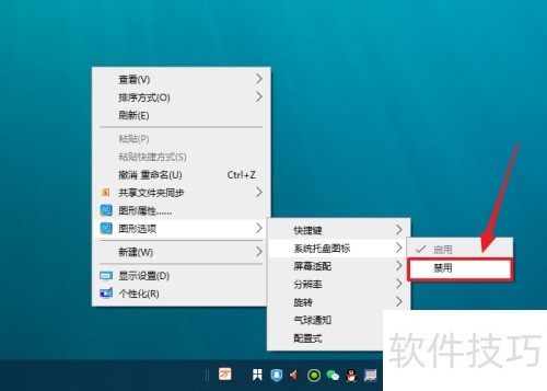 4、 点击三级菜单中的禁用项,即可关闭系统托盘图标,具体操作所示。