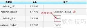 2、 进入数据库设置页面,在用户列表中选择需调整权限的账户(例如niebinin_durl),具体操作界面所示。