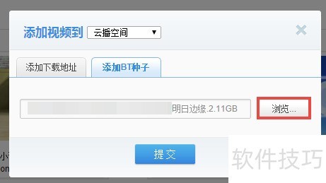 6、 选择添加BT种子文件,成功导入后点击提交即可完成操作。