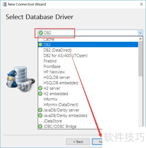 4、 选择数据库驱动,由于使用的是DB2数据库,因此需选DB2驱动,具体操作所示。