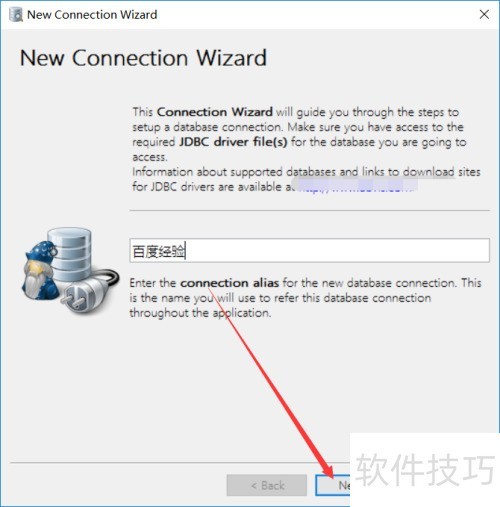 3、 在新建连接向导界面中,输入数据库连接名称,具体操作所示。