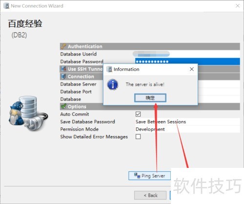6、 测试后若弹出The server is alive提示,说明配置无误,可点击完成,具体操作所示。