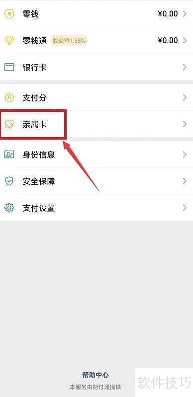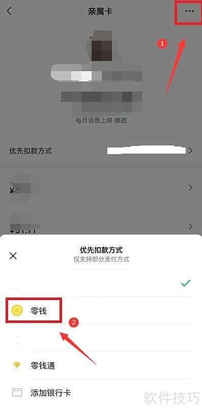 4、 在亲属卡详情页,点击右上角,于弹出选项中选择零钱或指定银行卡,即可完成支付方式设置。