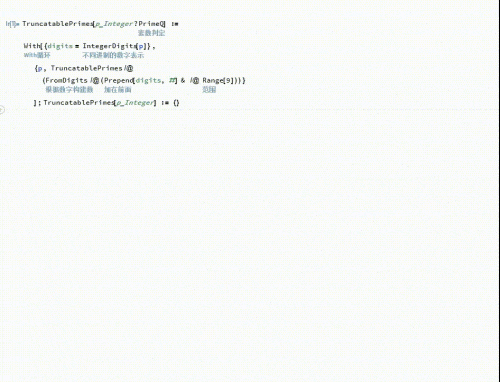 1、 定义一个函数TruncatablePrimes,接收一个正整数p作为参数。若p不是质数,则返回空列表;若p是质数,则创建一个仅包含p的列表,并对该列表进行扩展:对1到9中的每一个数字d,将其置于p的左侧形成新数,然后递归调用TruncatablePrimes处理该新数,并将返回结果合并到当前列表中。此过程逐层展开,持续生成由左截断仍保持为质数的数字组成的结构化列表,最终返回整个递归构造出的列表结果。