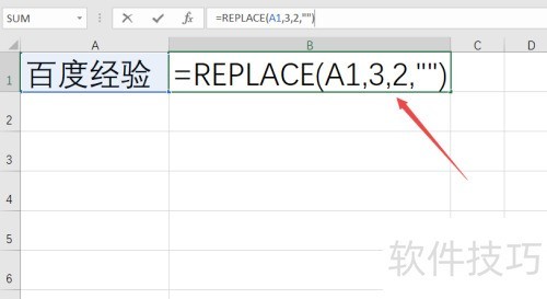 11、 在B1单元格输入公式=REPLACE(A1,3,2,),然后按下回车键完成操作。