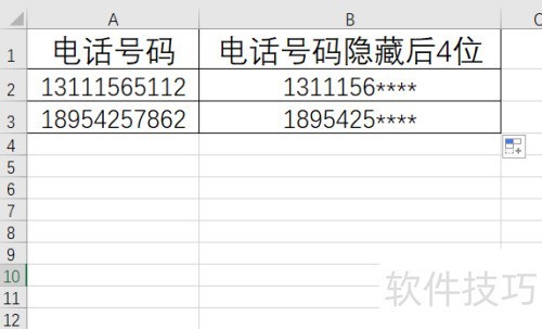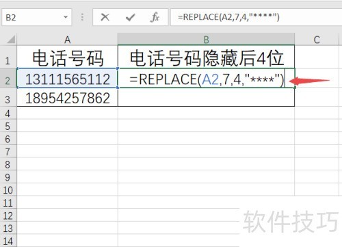 7、 在B2单元格输入公式=REPLACE(A2,8,4,),然后按下回车键确认操作即可完成。