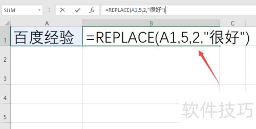 9、 在B1单元格输入公式=REPLACE(A1,5,2,很好)后按回车键确认。