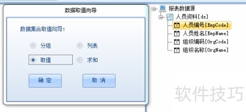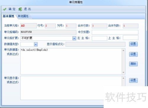 7、 右键点击单元格,选择单元格属性来设置数据值表达式,或直接从数据源中拖拽指定字段,按照向导提示选择取值方式,将其填入目标单元格。