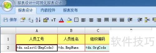 3、 在A2单元格输入:=ds.select1(EmpCode),表示从数据集中获取首条记录。