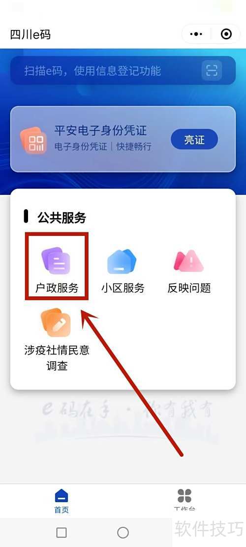 打开手机上的四川e码,登录验证后,选取户政服务扫码办理。