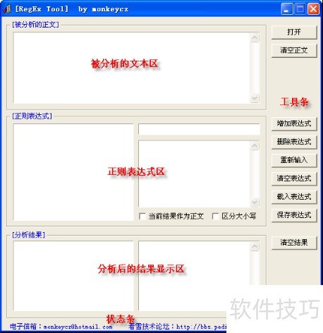 17、 在天空软件站或华军软件园,可下载到多种制作精良的正则表达式工具,每款各具特色。读者可自行下载试用,本书配套光盘中亦提供了一款实用工具,方便学习与实践。