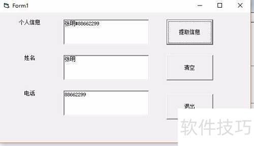 6、 运行程序后,在输入框中键入字符串,例如张明88662299,双击该字符串,再点击提取信息按钮,系统会自动分离出姓名与电话号码。如需清除已输入的内容,可点击清空按钮。若要结束程序,点击退出即可关闭窗口。