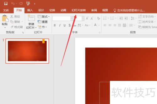 3、 如箭头所指,点击顶部的幻灯片放映选项卡。