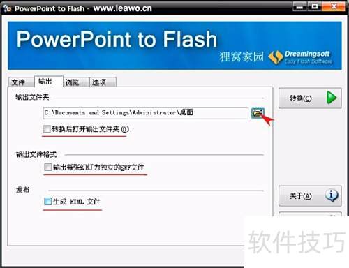 3、 点击选项可设定Flash文件的保存路径,并配置转换完成后的操作,如是否自动打开输出文件夹、将每张幻灯片导出为独立SWF文件、生成HTML网页文件等。