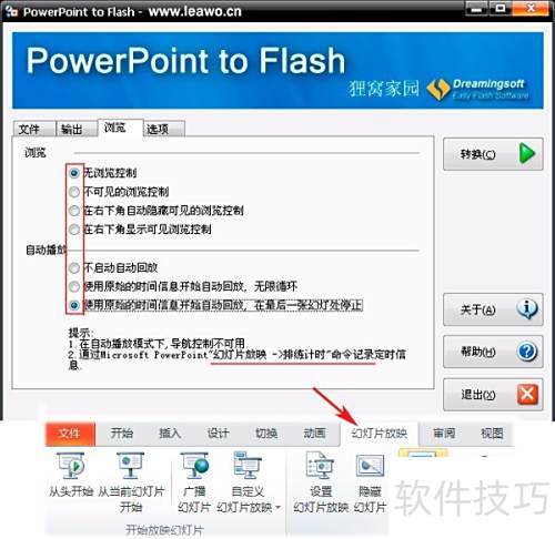 4、 切换至选项,此处主要用于设置浏览控制功能,通常无需特别调整。下方的自动播放建议选择第三项。若希望输出的Flash文件保留PPT中原有的动画效果,需在转换前对PPT进行一次完整的排练计时操作,确保动画顺序与时间设置正确,排练计时功能可在PPT的幻灯片放映菜单中找到并执行。