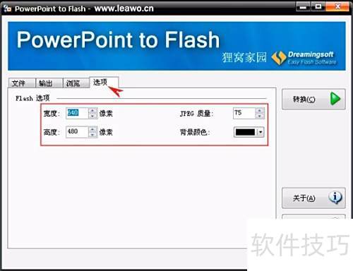 5、 最后一个为功能,可自定义输出Flash的像素、JPEG画质及背景色等参数。