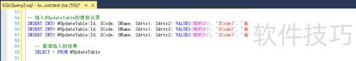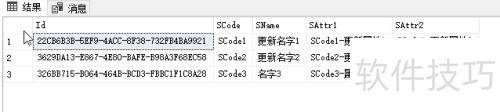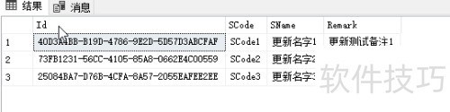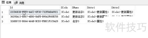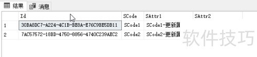 19、 将新记录插入更新表中,包含唯一标识、编码、名称及两个属性字段,各字段值分别为生成的全局唯一标识符、编码SCode2、名称名字2,以及两个属性值均设为SCode2-属性2,确保数据完整写入临时表UpdateTable。