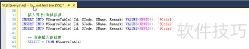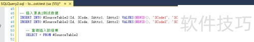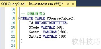 15、 向临时表 SourceTable2 中插入一条新记录,包含唯一标识 Id、编码 SCode2 及其对应的两个属性值,分别为SCode2-更新属性1和SCode2-更新属性2,确保各字段正确映射并生成新的全局唯一标识符作为主键。