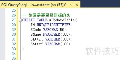 18、 将新记录插入临时更新表,包含唯一标识、编码、名称及两个属性字段。其中编码为SCode1,名称为名字1,属性一和属性二分别设置为SCode1-属性1。使用NEWID()生成全局唯一主键,确保每条数据独立可识别,完整写入所有指定列内容。