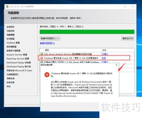 1、 安装SQL Server 2016时,常遇到功能规则检测失败的问题,系统提示PolyBase要求安装Oracle JRE 7 Update 51(64位)或更高版本。该问题主要源于计算机未安装符合要求的JRE 7运行环境。尽管提示说明支持更高版本,但实际测试表明,仅安装高于JRE 7的版本无法满足PolyBase的运行条件。为确保安装顺利进行,建议用户优先下载并安装64位的Oracle JRE 7 Update 51或其后续更新版本,以完全匹配SQL Server 2016的组件需求,避免因环境不兼容导致安装中断或功能异常。