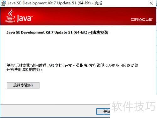 5、 安装完成后会显示相应界面,表明JDK 7已成功安装。若不使用Java相关工具,可跳过后续配置。如需使用Java开发工具,则需进行环境变量设置,具体配置步骤可参考提供的百度经验链接内容,按照指引完成即可。