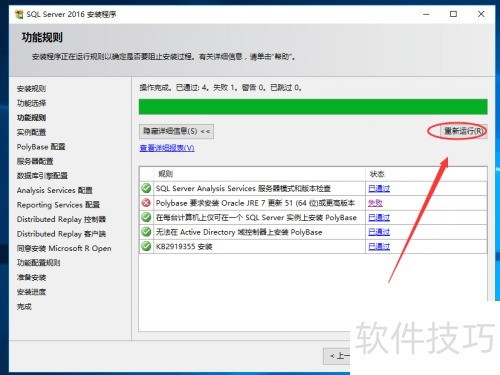 7、 返回SQL Server 2016安装界面,按照功能规则提示,点击重新运行按钮继续操作。