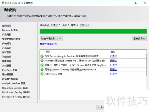 8、 检测完成后,确认SQL SERVER 2016的规则检查已通过,可继续执行安装步骤。