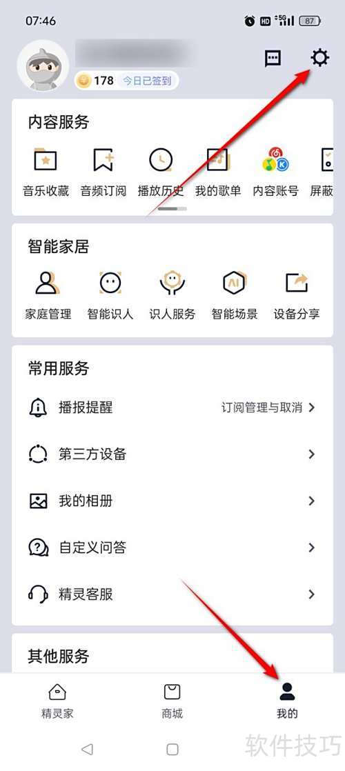 1、 进入天猫精灵我的界面,点击右上角齿轮图标即可。