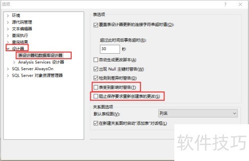 5、 进入工具栏的选项菜单,选择设计器中的表设计器和数据库设计器,取消勾选表受到影响时警告以及阻止保存要求重新创建表的更改两项,取消后保存表时将不再弹出警告提示,操作更加顺畅,无需反复确认。