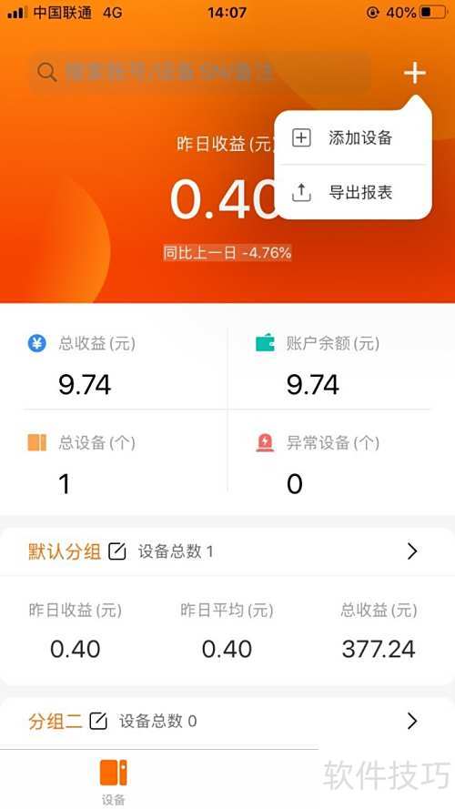 18、 打开网心云应用,点击右上角加号,从下拉菜单中选择添加设备。